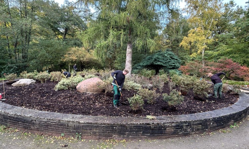 Für diesen Bereich des Rhododendron-Parks zuständig ist Gärtnerin Lena Lehsig. Unter ihrer Regie wurde schon im Jahr 2024 der Gehölzwildwuchs gerodet. Auszubildende entfernten die alten Sandsteinplatten und legten den Weg rund um das Beet mit wassergebundener Wegedecke neu an. Ebenfalls auf dem Programm standen ein Entwässerungssystem und neue Erde, bevor ab September 2025 das Pflanzsubstrat für die Rhododendron aufgebracht und im Oktober dann gepflanzt werden konnte. „Lena Lehsig und unser Betriebsmeister Steffen Wenker hatten im vergangenen Jahr die Idee, diesen Bereich wieder auf Vordermann zu bringen. Ein arbeitsreiches und zeitintensives Projekt, aber für uns auch eine tolle Möglichkeit, ein bislang vernachlässigtes Stück Park zu erneuern und so eine Fläche für die ansonsten nur im weniger gut zugänglichen Rhododendron-Steingarten befindlichen, schwachwüchsigen Rhododendron-Wildformen zu schaffen“, erklärt Parkleiter Dr. Hartwig Schepker. Pflanzen, die teilweise schon seit 2014 aus Stecklingen und Samen selbst im Park herangezogen wurden.